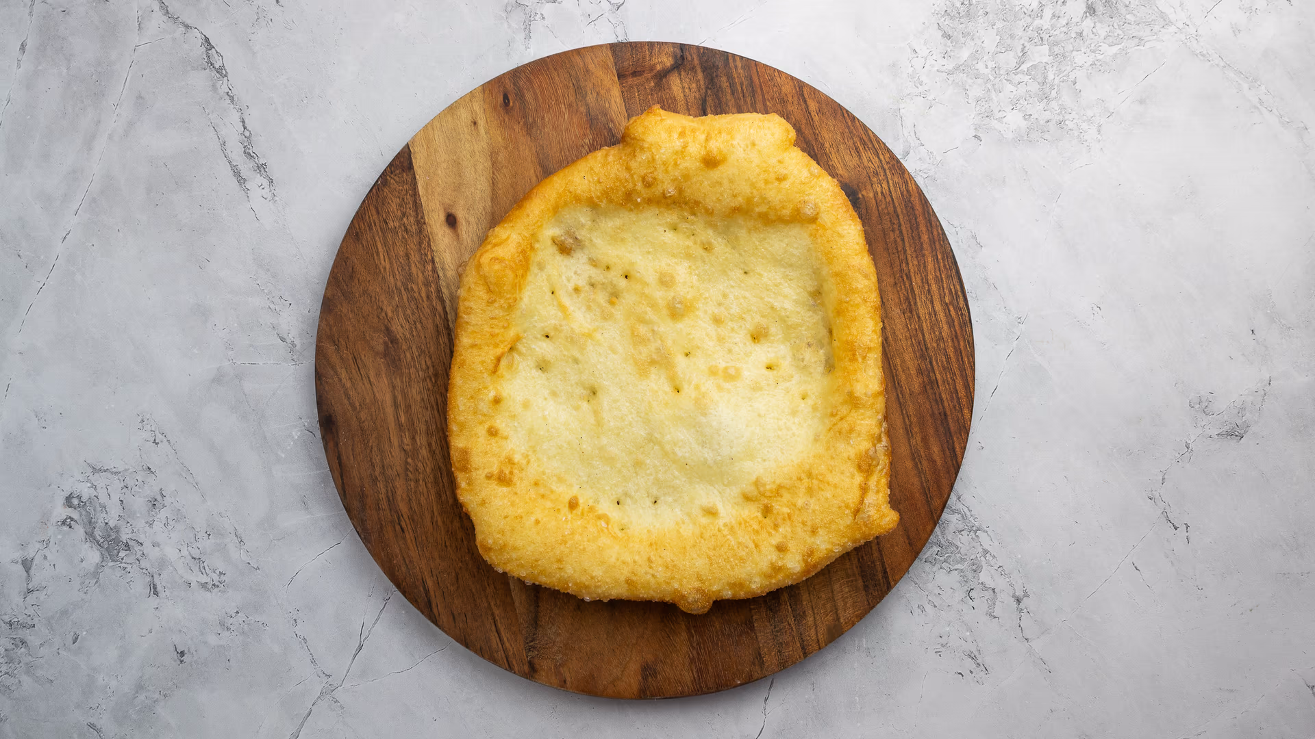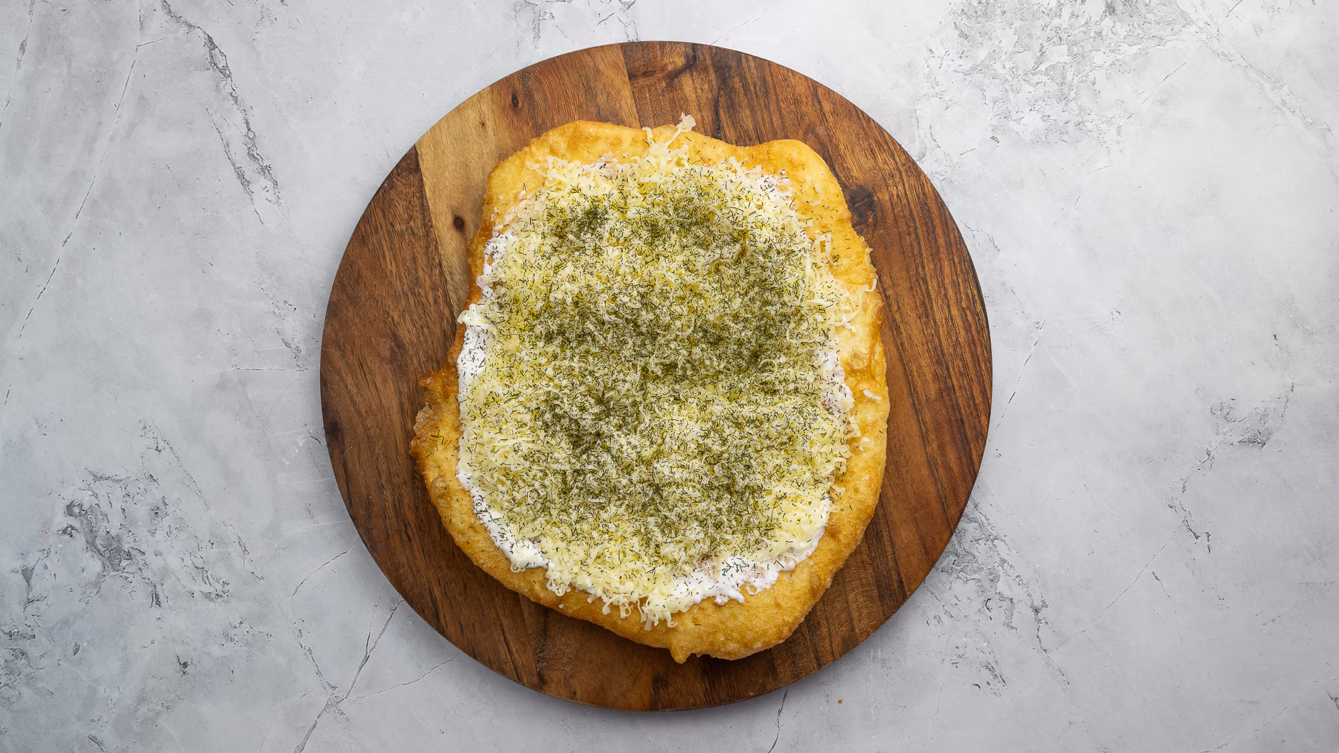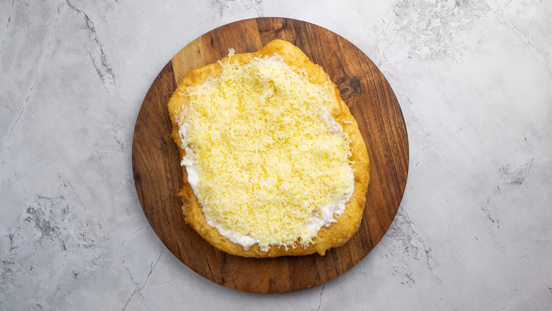 Lángos tejföllel megkenve és sajttal gazdagon megszórva. Vegetáriánus étrendet követők számára is tökéletesen alkalmas.
