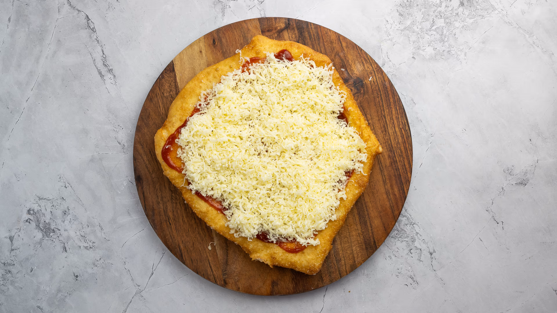 Lángos pizzás alappal, gazdagon megszórva reszelt sajttal. Vegetáriánus étrendet követők számára is tökéletesen alkalmas.