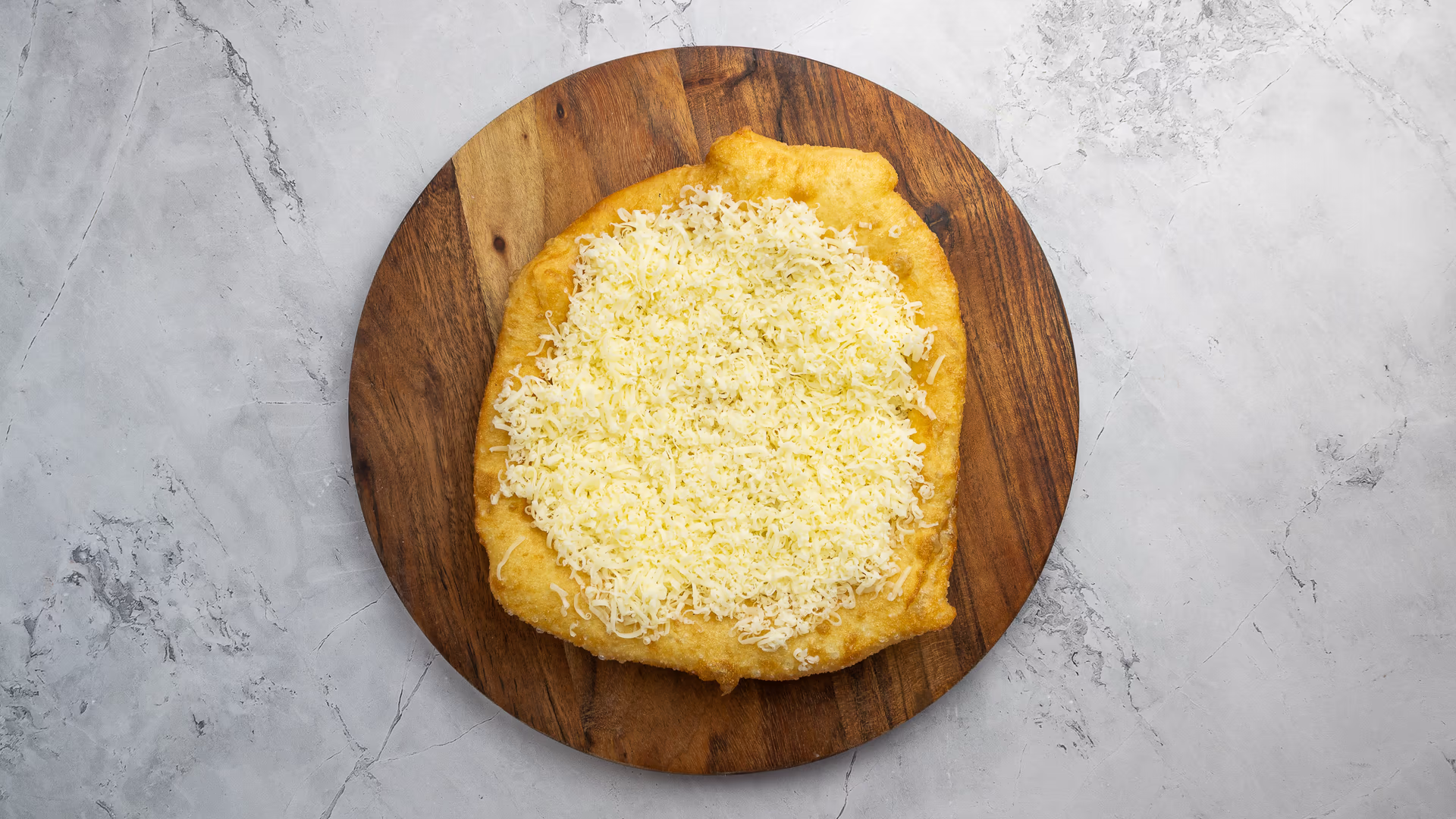 Lángos gazdagon megszórva reszelt sajttal. Vegetáriánus étrendet követők számára is tökéletesen alkalmas.