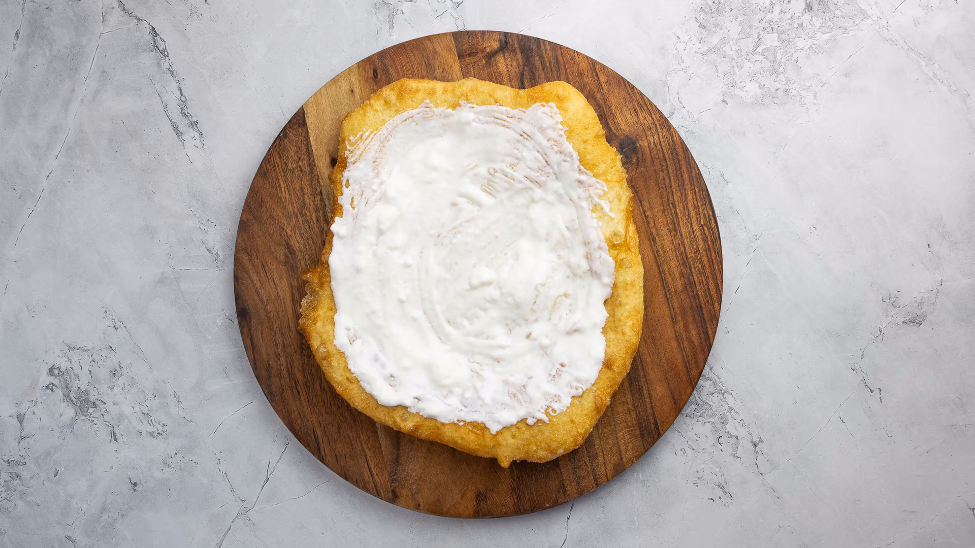 Lángos tejföllel megkenve. Vegetáriánus étrendet követők számára is tökéletesen alkalmas.